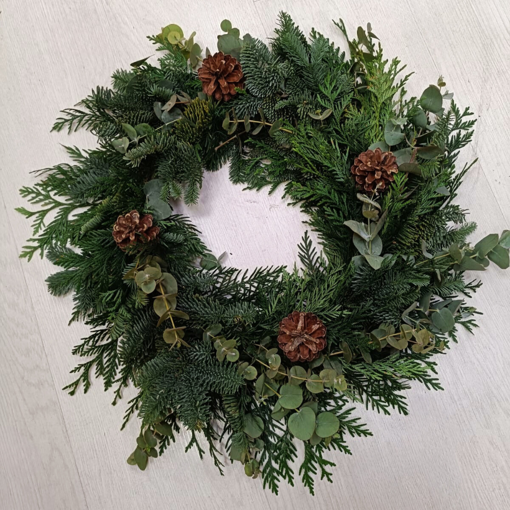 Corona navideña artesanal pequeñs elaborada con follaje fresco de pino y ciprés, decorada con ramas de eucalipto y elegantes piñas naturales. Perfecta para adornar puertas, paredes o mesas durante la temporada navideña, aportando un toque cálido y natural a tu hogar.