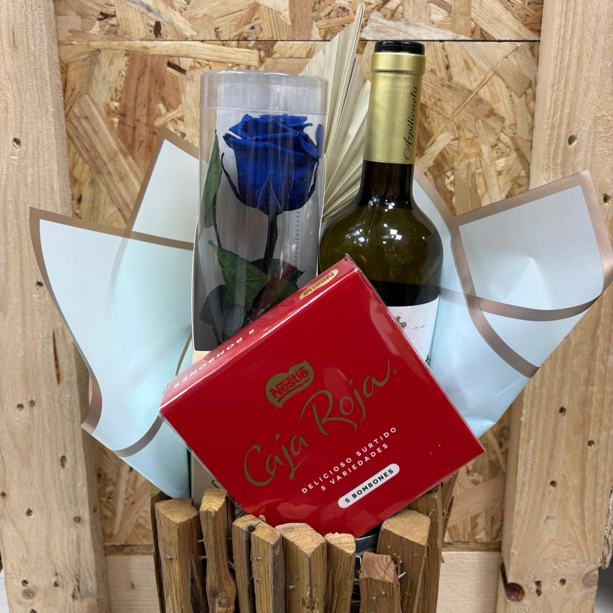 Sorprende este Día del Padre con un regalo único y elegante: pack compuesto por una rosa liofilizada en tono azul, una botella de Vino tinto Azpilicueta y una deliciosa caja de bombones en estuche rojo.