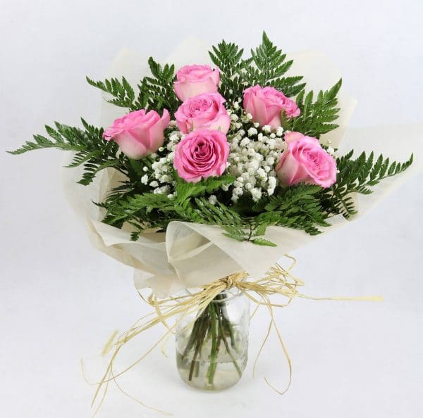 Ramo de 6 rosas rosas y decorado con verdes silvestres y paniculata. Elaborado por nuestras floristas con flores naturales de la mejor calidad para asegurarte una experiencia única.