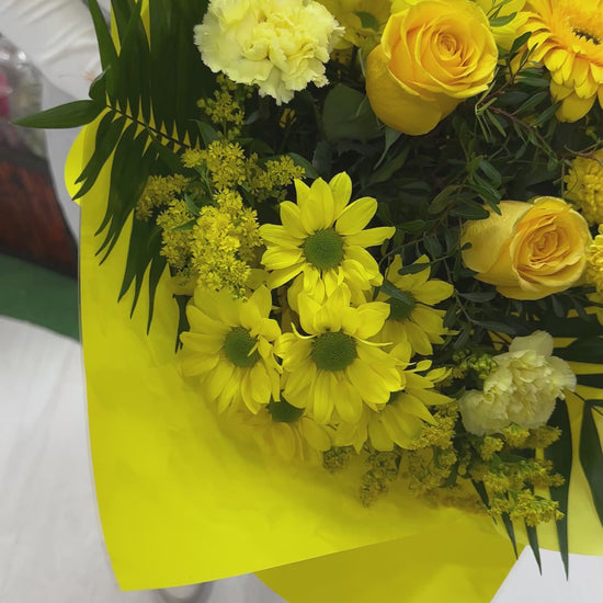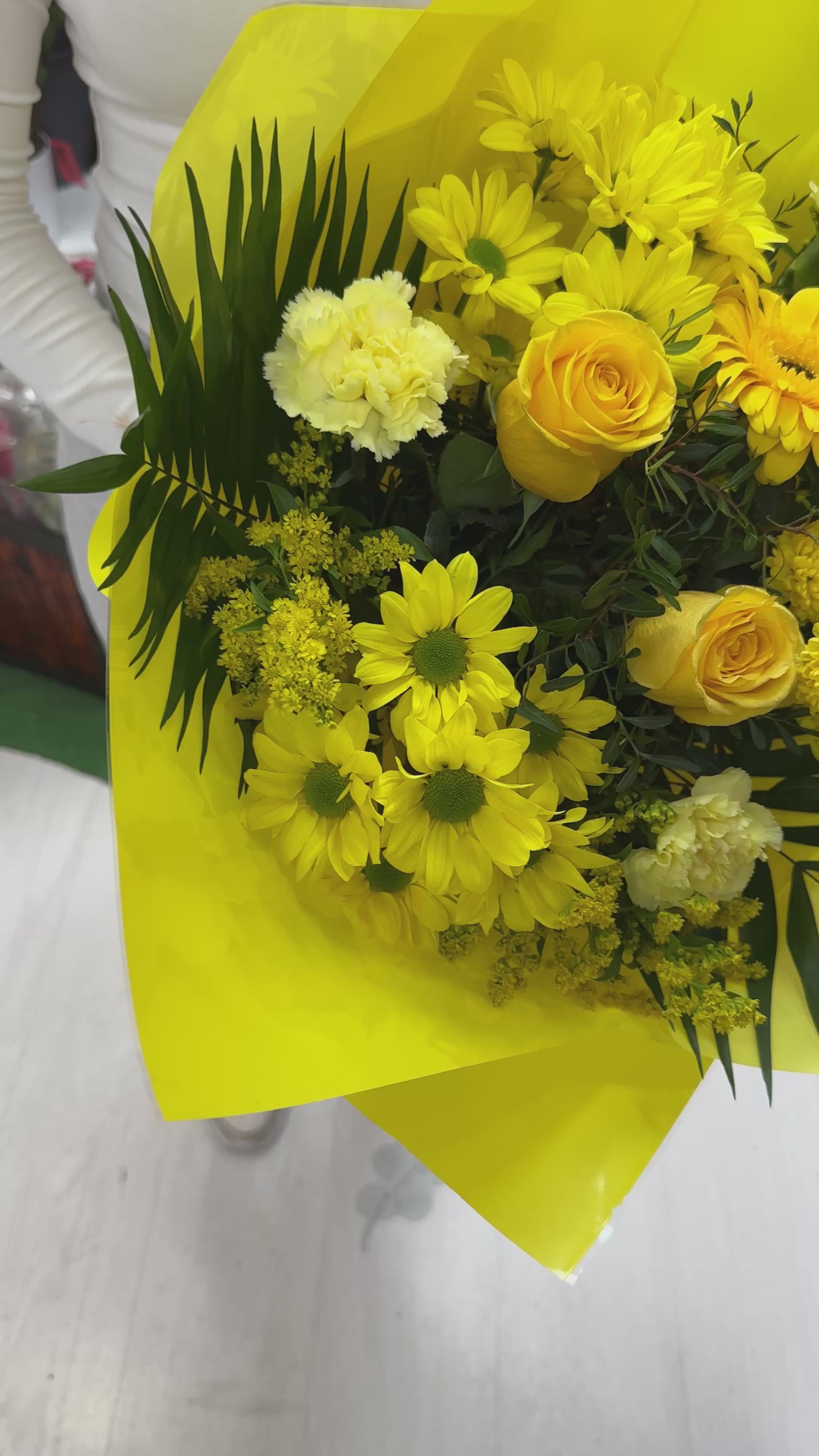 Sorprende con nuestro exclusivo Ramo Yellow 21, un vibrante bouquet de flores amarillas compuesto por girasol, margaritas, rosas y gerberas, cuidadosamente seleccionadas para transmitir alegría, energía y positividad. Su diseño armonioso, acompañado de verdes decorativos y un elegante envoltorio, lo convierte en un regalo único y lleno de significado.